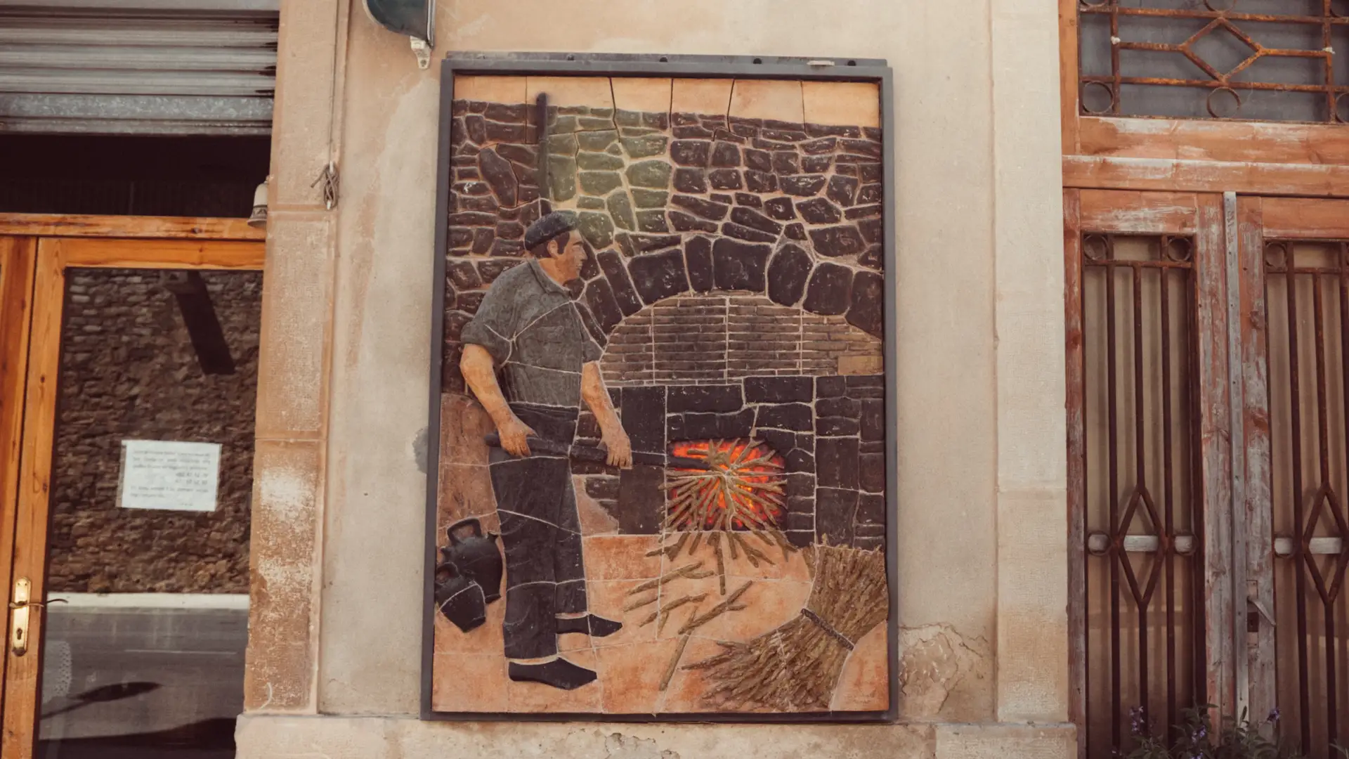 Elements: The image illustrates the moment when the stonemason feeds with a bundle of wood, usually olive branches, the mouth of the oven, as was traditionally done, and thus increases the temperature for the cooking of the pieces of black ceramic inside. Right next to the mouth of the oven we can see a pair of black armchairs, and the fact is that black ceramics are the hallmark of the town. Verdú was declared a Craft Interest Zone by the Generalitat de Catalunya for the black ceramics, which today are only made in Quart and Verdú.