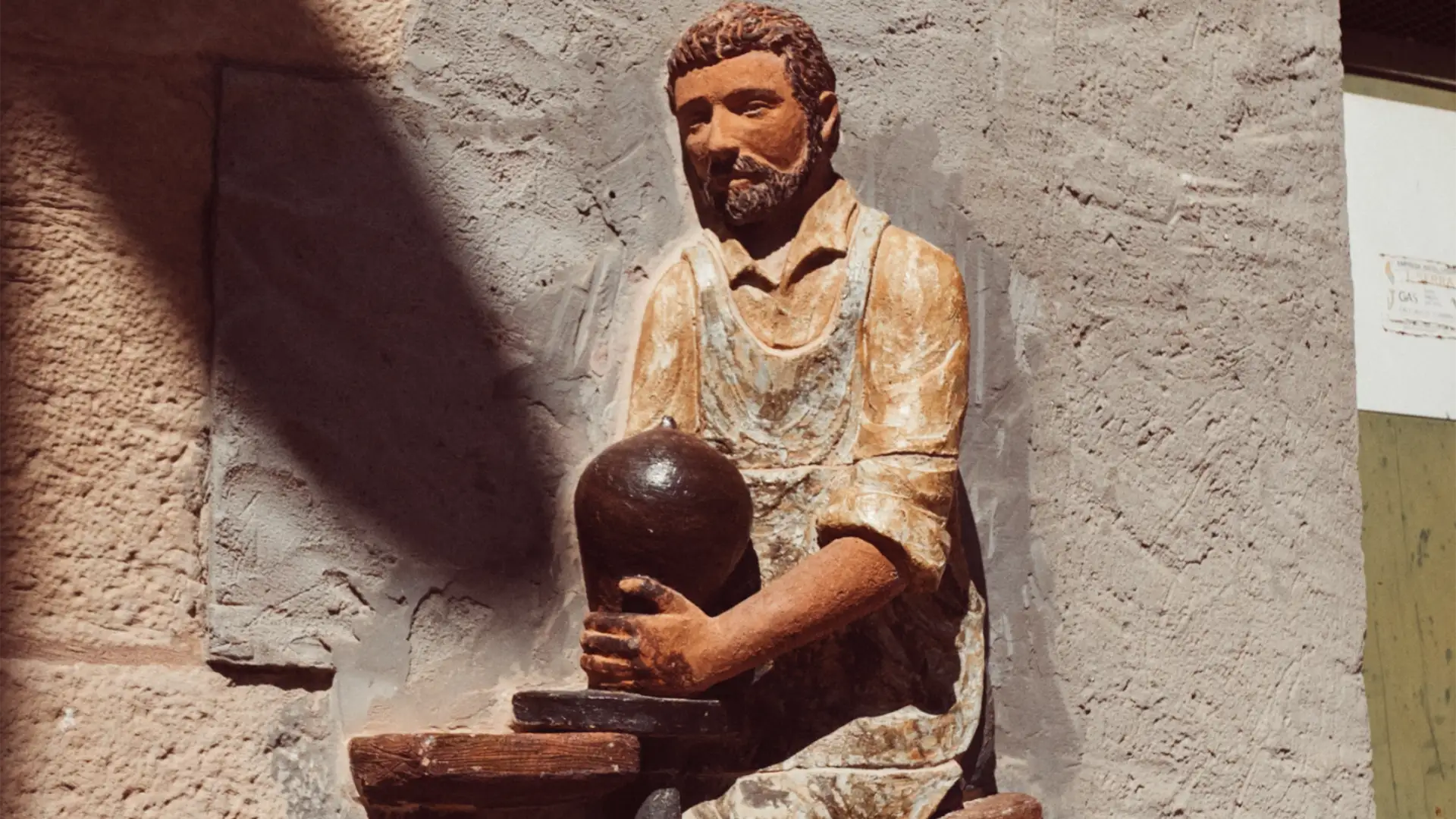 Elements: In this mural, we can see a Potter working on the wheel while making a pitcher, the traditional armchair of Verdú. This mural is located on the facade of a house, and through it the daily activity that took place there for years is projected outwards. Verdú earthenware pieces are known for the optimal quality of the clay. The property of refreshing drinking water has always made the armchair very popular.