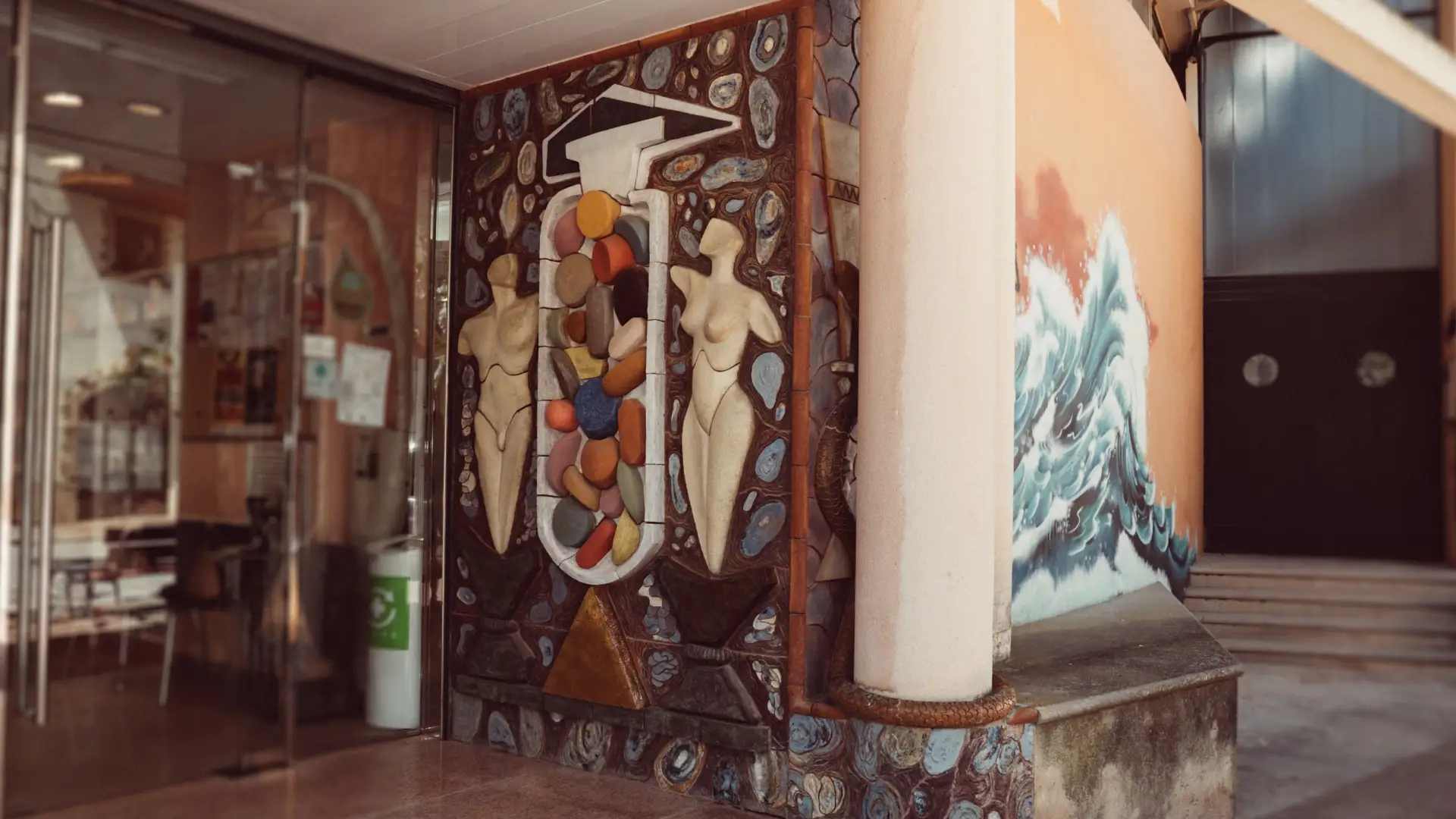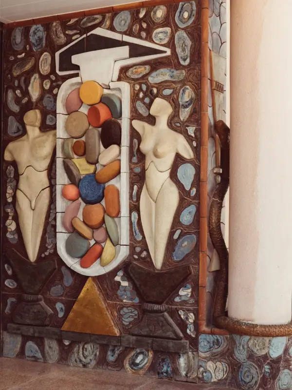 Elements: The elements we find in this mural represent a scene about balance and health. Two bodies; one male and the other female appear on a scale in perfect balance, in between there is a flask containing the solution, the remedy; tablets, capsules, … on a background in which there are cells. A prominent element of the mural is the snake, which secretes poison and at the same time has the ability to shed its skin, the hope for healing, coiled and half hidden in the entrance pillar.