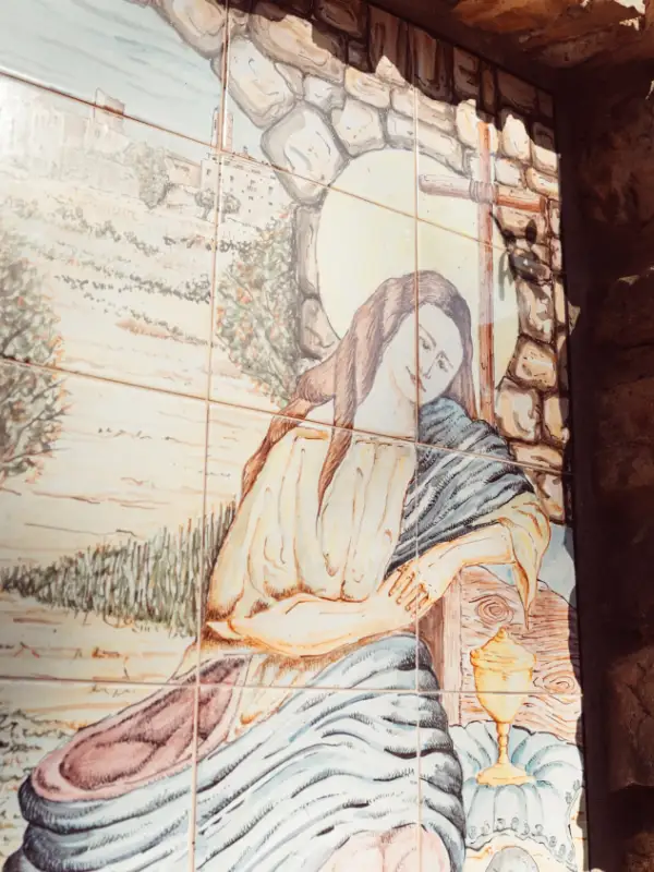 Elements: Panel consisting of fifteen painted tiles. Human figure of a woman representing Saint Magdalene with architectural and landscape elements. The image of Mary Magdalene appears to us represented according to traditional iconography; the scene is located in two distinct spaces, separated by a stone wall. In the foreground the image of Magdalene depicted in elegant clothes and with long hair, with the attributes of the skull and the jar of ointments referring to the moment when she washed the feet of Jesus Christ. The Castle tower and the Church bell tower appear in the background. These two elements are the result of the innovation introduced by the ceramist.
