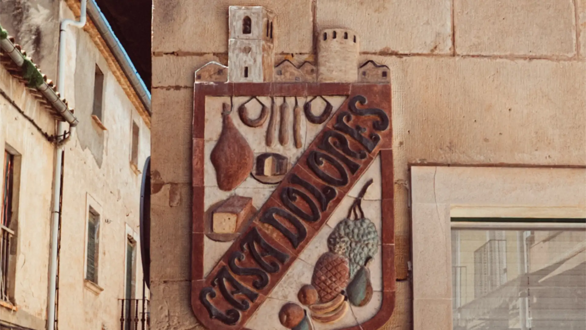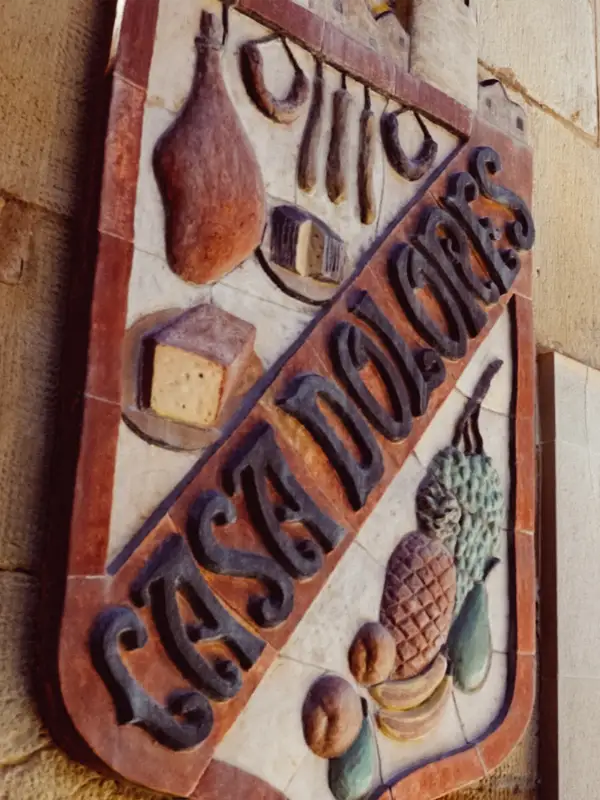 Elementos: Josep Roca Torres con motivo del 75º cumpleaños de la tienda de víveres quiso colocar en 1987 este mural en la fachada de la tienda, a la vez que aconteció el cartel anunciador. Casa Dolores, a sus inicios no era solo una tienda de víveres, sino que durante los primeros años, en la tienda se podía comprar de todo: tela a metros, ropa interior, sábanas, zapatos y alpargatas, colonias y también licores a granel. La especialización llegó hacia los años sesenta, cuando el negocio se centra básicamente a los embutidos, la fruta y la verdura. Josep Roca realizó el diseño, incorporando la silueta de la torre del Castillo y el campanario de la iglesia al esbozo, y el artista Enric Orobitg fue el encargado de la ejecución.